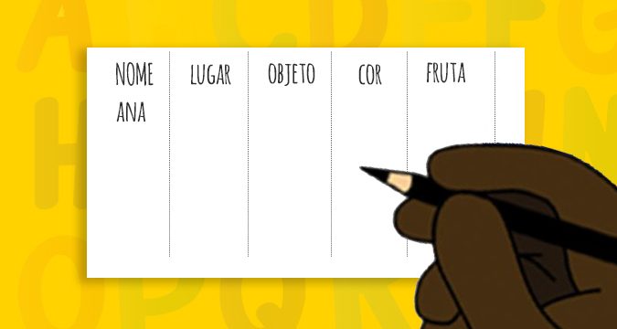 O grupo, incluindo crianças e adultos, escreve num papel, colocando uma tabela lado a lado, as palavras, Nome, lugar, objeto e o que mais vier à cabeça. Pode ser filme, país, frutas, animais e o que mais vocês acharem legal. Faz-se um sorteio com a letra que vai dar início ao jogo ou mesmo por quantidade de dedos nas mãos lançadas ao centro, contados até chegar à letra.